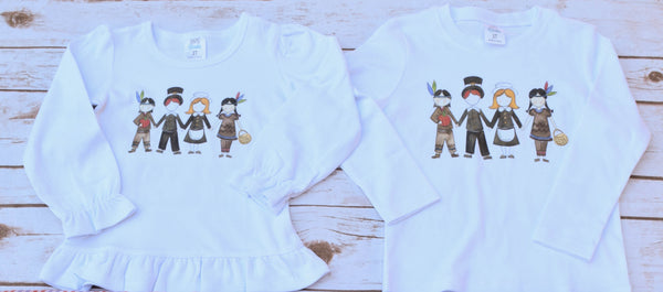 How adorable is this plaid pattern AND how much cuter would a pair of pants be paired with our pilgrim watercolor shirt?